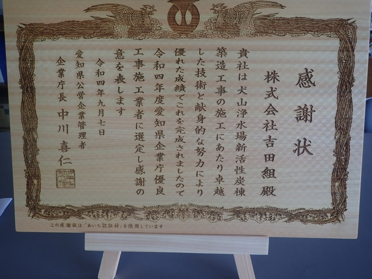 愛知県知事より優良建設工事施工業者として感謝状をいただきました。