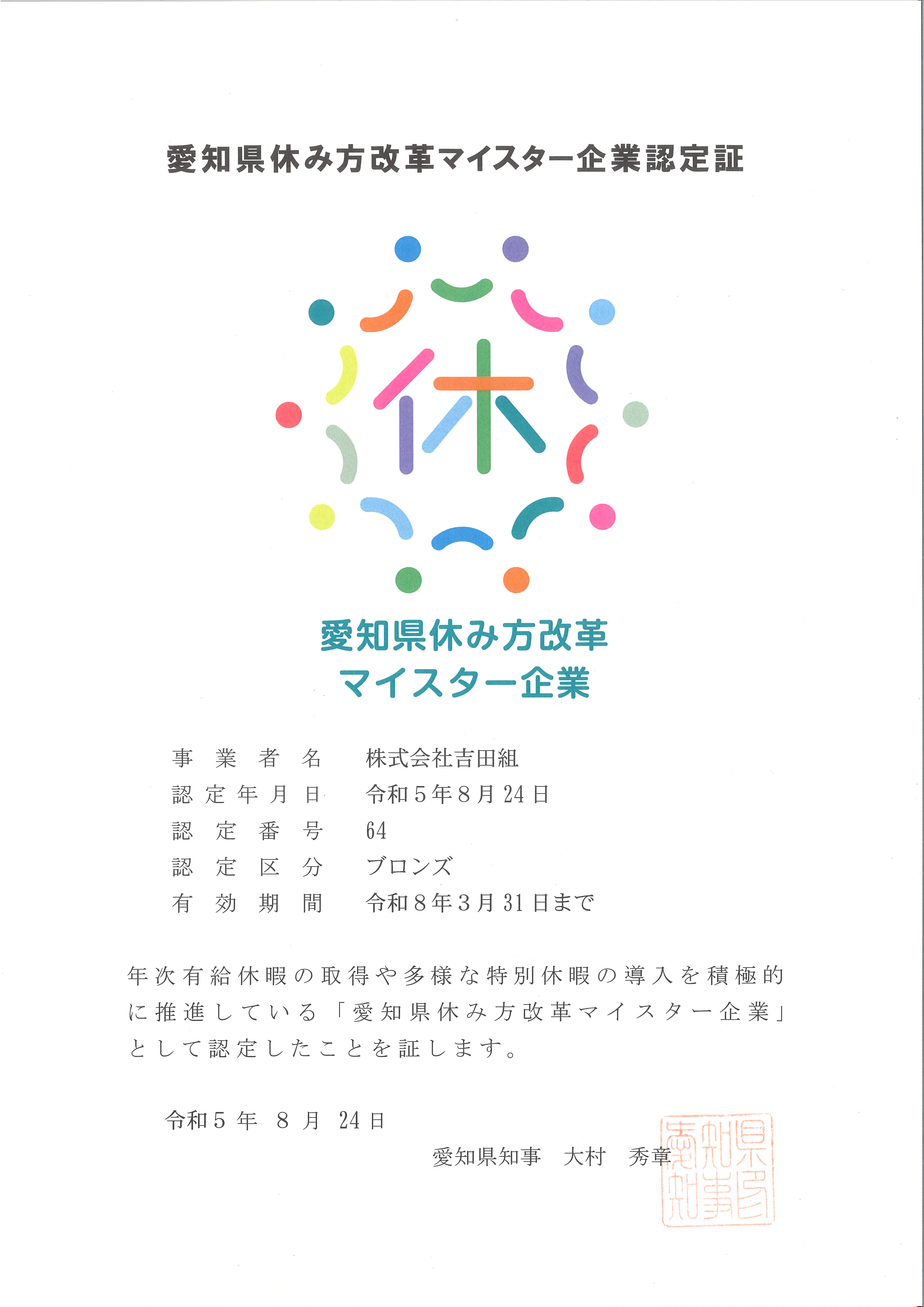 愛知県休み方改革マイスター企業(ブロンズ)に認定登録されました。